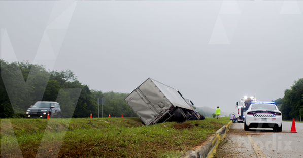Calkiní, Camp. 16 de julio del 2020.-La madrugada de este jueves, un tráiler que transportaba tomates, se salió del carril y quedó varado en medio del camellón que divide la carretera federal Campeche-Mérida a la altura del kilómetro 94, esto luego de que su guiador perdiera el control del volante de la pesada unidad tras dormitar.