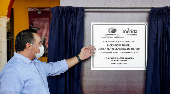 En compañía de los regidores de la comisión de Cultura y Espectáculos y del Dr. Raúl Enrique Rivero Canto, coordinador del Comité Científico Nacional de Ciudades y Pueblos Históricos de México perteneciente al Consejo Internacional de Monumentos y Sitios; el Alcalde develo la placa alusiva al Bicentenario del Cementerio General, acto con el que también dio por concluido el simposio académico.