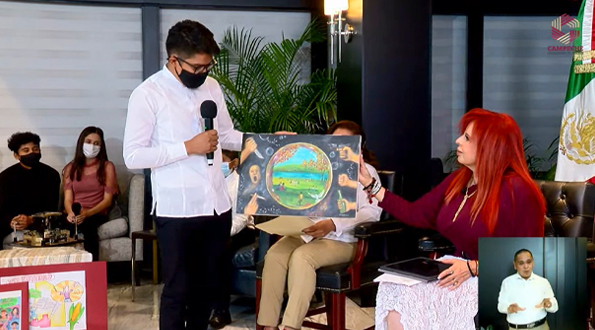 Desde el cuarto piso del Palacio de Gobierno, la Gobernadora arrancó el programa con la presencia de jóvenes que participaron en un concurso de pintura del Consejo Estatal de Población y presentó a la joven Alejandra Monserrat Arellano Victoria del plantel Conalep, Ciudad del Carmen, ganadora de la medalla de la empresa Ingenieros Civiles Asociados, quien ocupó la silla de la Gobernadora, y con la que platicó en diferentes momentos.