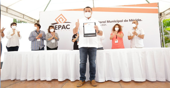 Mérida, 13 de junio de 2021. Tras concluir el cómputo en el Consejo Municipal del Instituto Electoral y de Participación Ciudadana de Yucatán, Renán Barrera Concha recibió esta tarde la constancia de mayoría relativa que lo acredita como alcalde electo de Mérida, con lo que también se convierte en el primer Presidente Municipal reelecto en la historia de la capital yucateca.