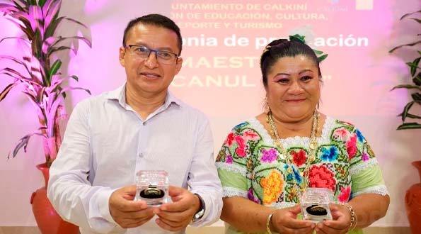 Calkiní, Campeche a 06 de octubre 2023.- Autoridades municipales entregaron premios y reconocimientos a los docentes María Virgilia Ek Haas y José Melchor Cuevas Cuevas, ganadores del concurso “Maestro Ah Canul 2023”, durante un evento realizado en las instalaciones de la Escuela Normal de Licenciatura en Educación Preescolar de Calkiní.