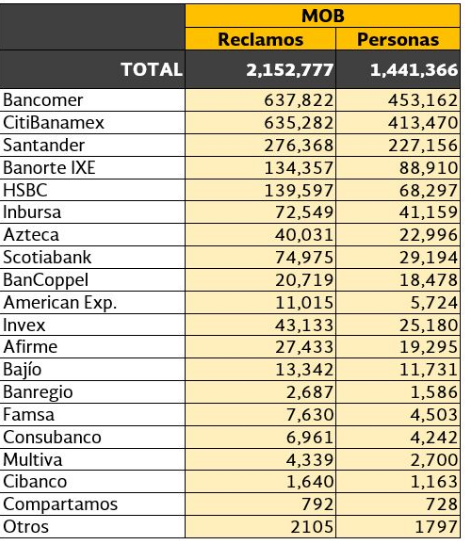 La institución financiera que registró el mayor número de reclamaciones por MOB fue BBVA Bancomer con 637 mil 822 y con una afectación a 453 mil 162 personas; CitiBanamex con 635 mil 282 reclamos y 413 mil 470 personas afectadas; Santander con 276 mil 368 reclamaciones y 227 mil 156 personas afectadas.