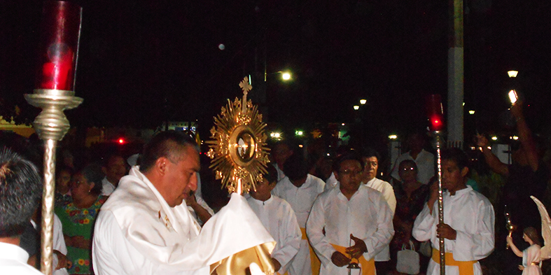 Calkiní, Cam. a 1 de Junio del 2018.- Cientos de fieles católicos, celebraron con una solemne misa y procesión la adoración del cuerpo y la sangre de cristo (Corpus Christi), después de a haber transcurrido los 60 días de la resurrección. Celebración que tuvo lugar en la iglesia de San Luis Obispo de esta Ciudad. Donde el Pbro. Juan Eliodoro Kantún Huchim exhorto a la comunidad para estar en santidad con la eucaristía.