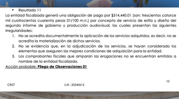 Calkiní, Camp. 07 de Agosto del 2024.- Con un valor de $314,440.01 (trescientos catorce mil cuatrocientos cuarenta pesos 01/100 m.n.) por concepto de servicio de estilo y diseño del segundo informe de gobierno municipal y producción audiovisual, las cuales, la Auditoría Superior del Estado de Campeche, detectó tres irregularidades.