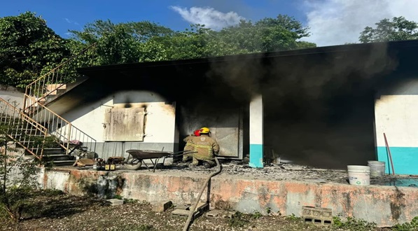 Escárcega, Camp. 05 de Agosto del 2024.- Con daños materiales considerables resulto un antiguo edificio que hace unos años atrás funcionó como cuarto frío, esto debido a un incendio que se generó al quemar un enjambre de abejas y se terminará saliendo de control, por lo cual tuvieron que intervenir personal de protección civil municipal para combatir las llamas.
