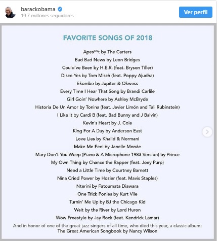 El ex presidente Barack Obama publicó su resumen anual de canciones favoritas el viernes (28 de diciembre), una lista ecléctica de rock, pop, soul, R&B, hip-hop y latino que incluye a todos, desde The Carters hasta Brandi Carlile, Khalid & Normani, Chance the Rapper, Courtney Barnett, J. Cole, Cardi B, Ashley McBryde, Jay Rock, Lord Huron, Kurt Vile y la cantante maliense Fatoumata Diawara.