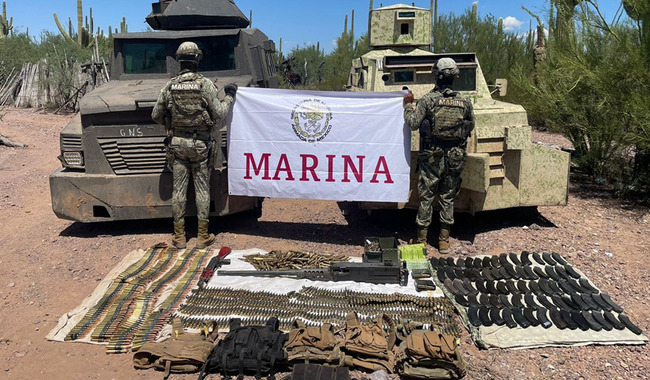 Ciudadde México a 06 de Septiembre de 2024.– La Secretaría de Marina a través de la Armada de México, por medio de la Sexta Región Naval, con sede en Guaymas, Sonora, informa que el pasado 3 de septiembre del presente año, personal naval aseguró dos vehículos con blindaje artesanal, armamento y cartuchos en la comunidad de Banori, en el municipio de Caborca, Sonora.