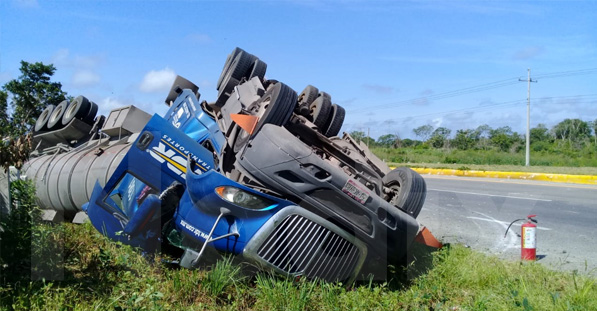 Pocboc, Hecelchakán, 15 de agosto de 2019.- Luego de que el conductor de un tráiler perdiera el control de la pesada unidad, terminó con las llantas para arriba, en la carretera federal Campeche-Mérida a la altura del kilómetro 66 del poblado de Pocbo, Hecelchakán.