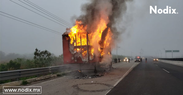 Pomuch, Hkan.30 de diciembre de 2019.- Alrededor de las 7:30 de la mañana de este último lunes del año 2019, se registró el incendio de un tráiler que transportaba aproximadamente 20 toneladas de botanas, los hechos se suscitaron en el kilómetro 50 de la carretera federal Mérida-Campeche, a la altura de la villa de Pomuch.