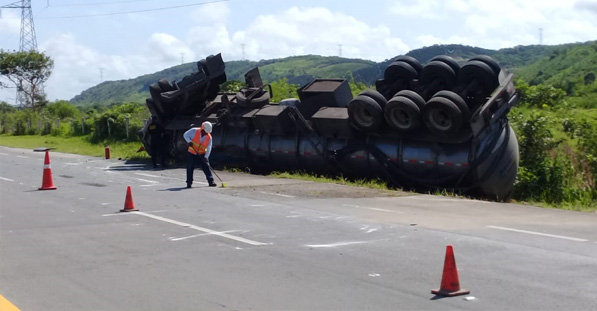 Pocboc, Hecelchakán, 15 de agosto de 2019.- Luego de que el conductor de un tráiler perdiera el control de la pesada unidad, terminó con las llantas para arriba, en la carretera federal Campeche-Mérida a la altura del kilómetro 66 del poblado de Pocbo, Hecelchakán.