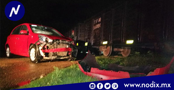 Calkiní, Camp. 28 de julio de 2019.- Tremendo susto se llevo el conductor de un march, con placas de circulación DJL-29-21 del estado de Campeche, al querer atravesar la linea del tren que se ubica entre el poblado de Tepakán y Calkiní justo cuando el tren se aproximaba.