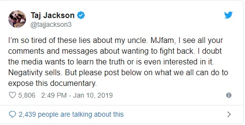 "Estoy tan cansado de estas mentiras acerca de mi tío. MJfam, veo todos sus comentarios y mensajes acerca de querer defenderse", escribió en Twitter. "Dudo que los medios quieran conocer la verdad o incluso estén interesados en ella. La negatividad se vende. Pero por favor, publique a continuación lo que todos podemos hacer para exponer este documental".